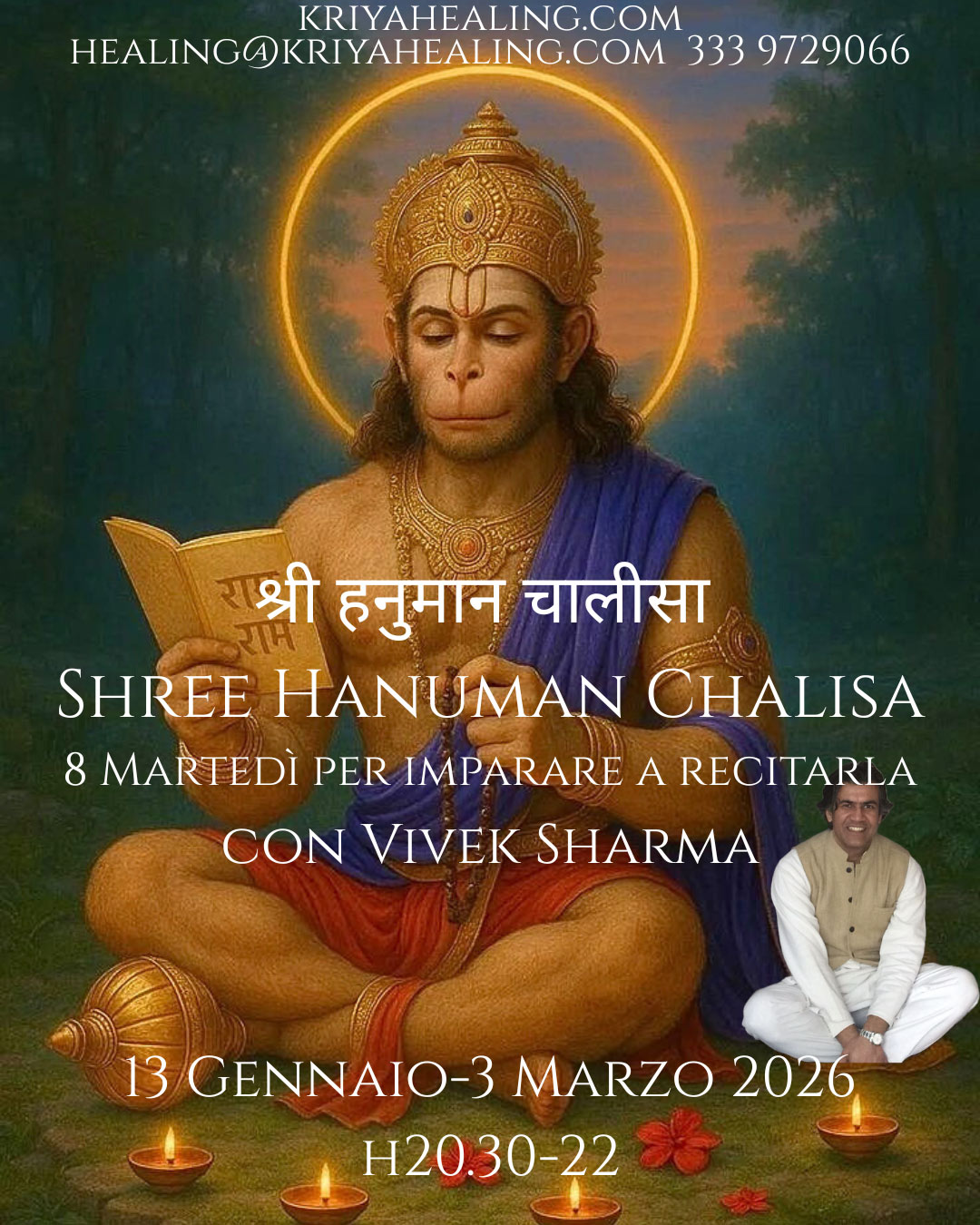 • Saranno 8 Lezioni su zoom, di 1 ora ½ ciascuna, ogni Martedì, giorno dedicato ad Hanuman, dal 13 Gennaio al 3 Marzo 2026, h 20.30-22. Dopo ogni diretta, verrà inviata via email la Videoregistrazione ad accesso illimitato.